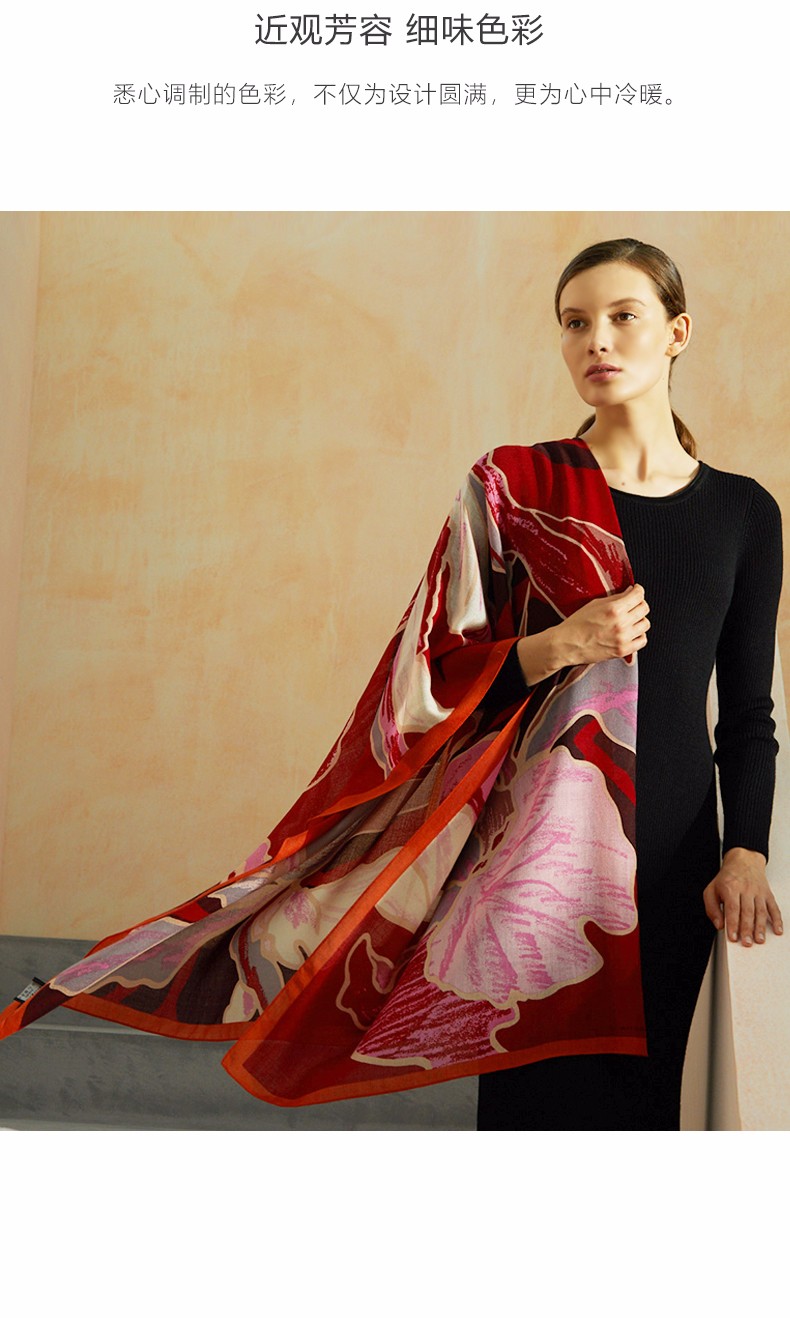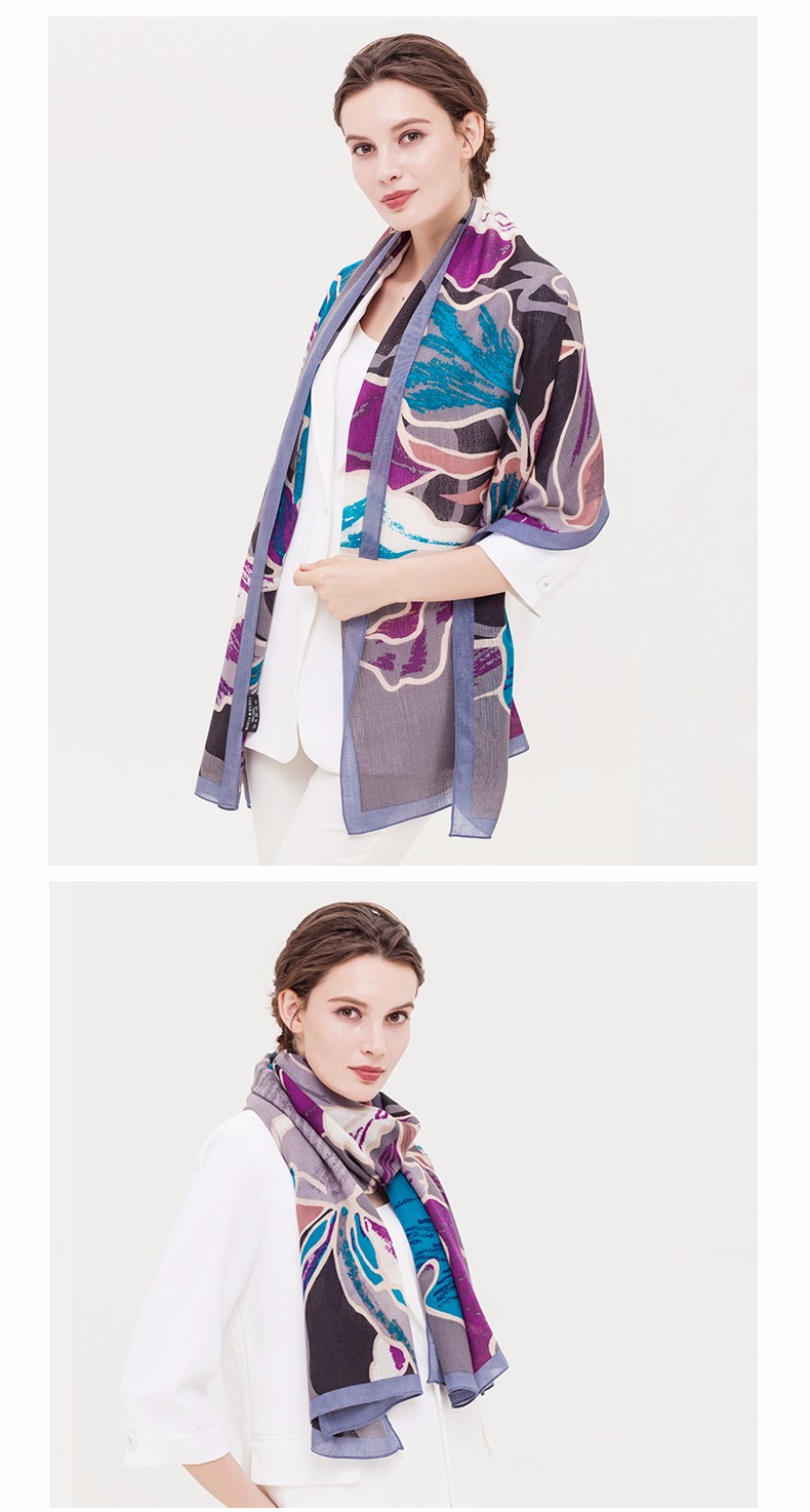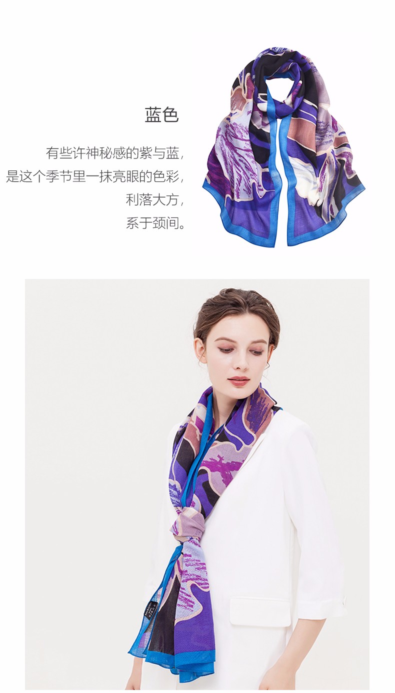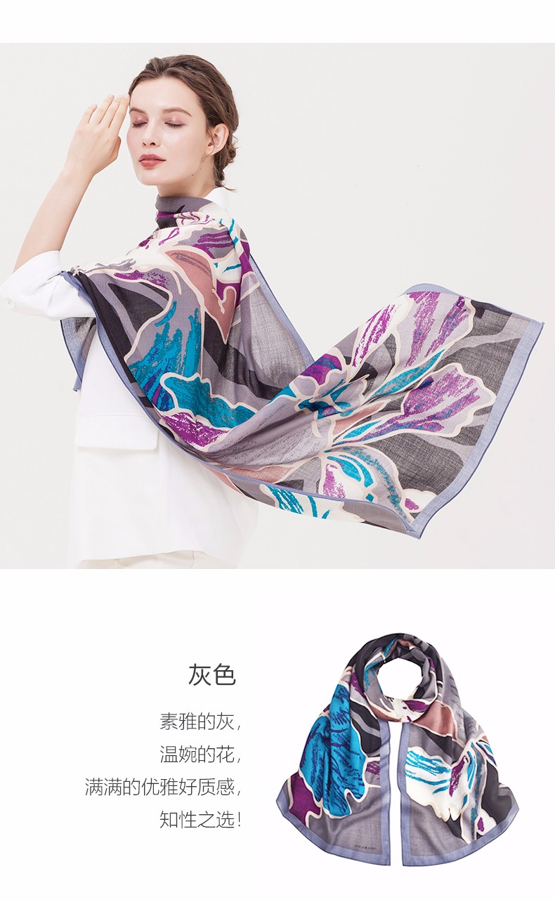 华丽的鸢尾花图案围巾绕在颈上显示出美丽的线条和花色。