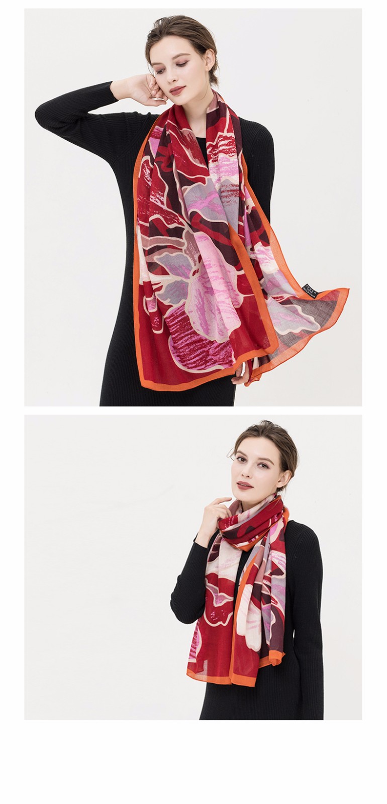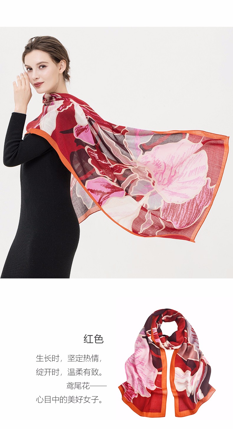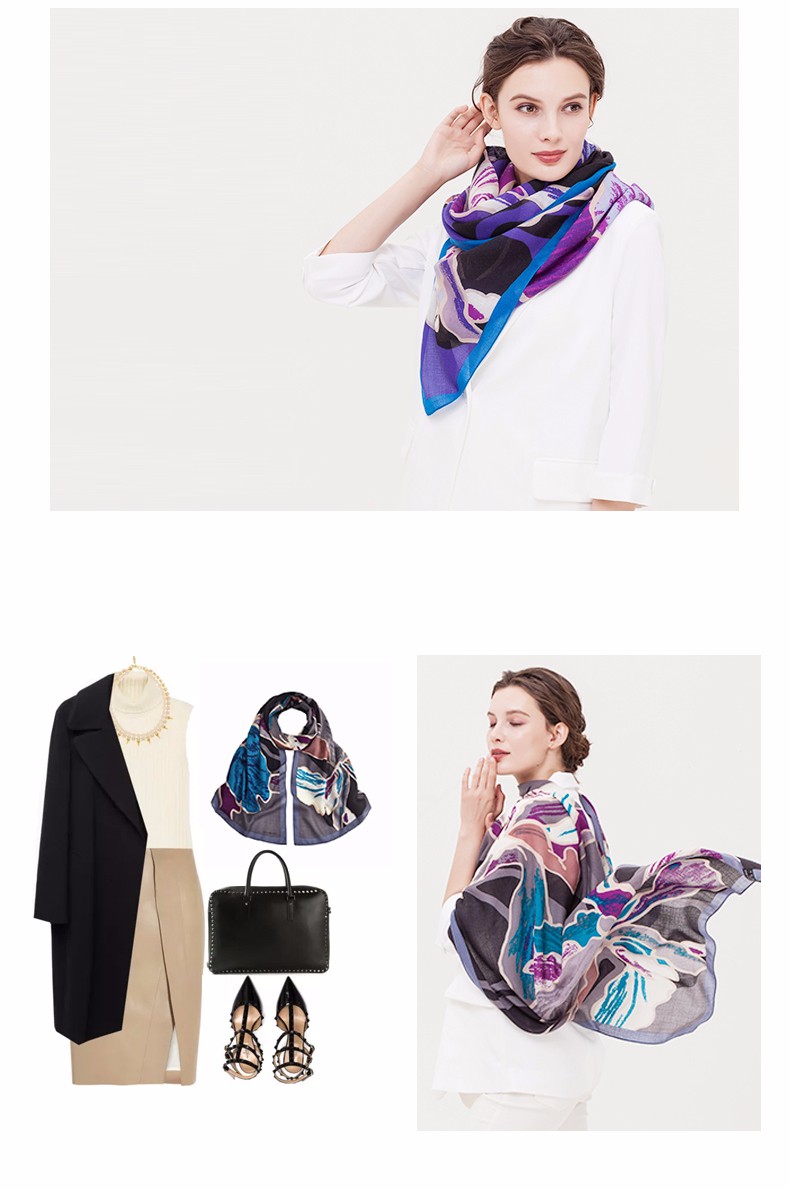华丽的鸢尾花图案围巾绕在颈上显示出美丽的线条和花色。