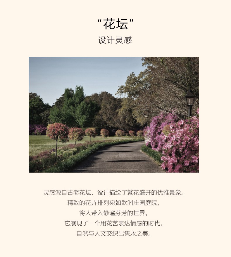 灵感源自古老花坛,设计描绘了繁花盛开的优雅景象。精致的花卉排列宛如欧洲庄园庭院,将人带入静谧芬芳的世界。它展现了一个用花艺表达情感的时代,自然与人文交织出隽永之美。