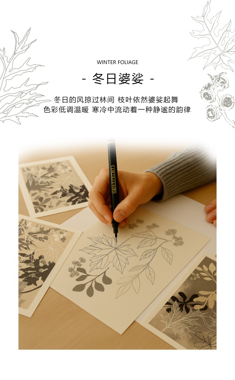 冬日的风掠过林间,光秃的枝叶依然婆娑起舞,寒冷中流动着一种静谧的韵律。 以简化叶形表现树影摇曳,色彩低调温暖,展现冬季自然的安静舞动。