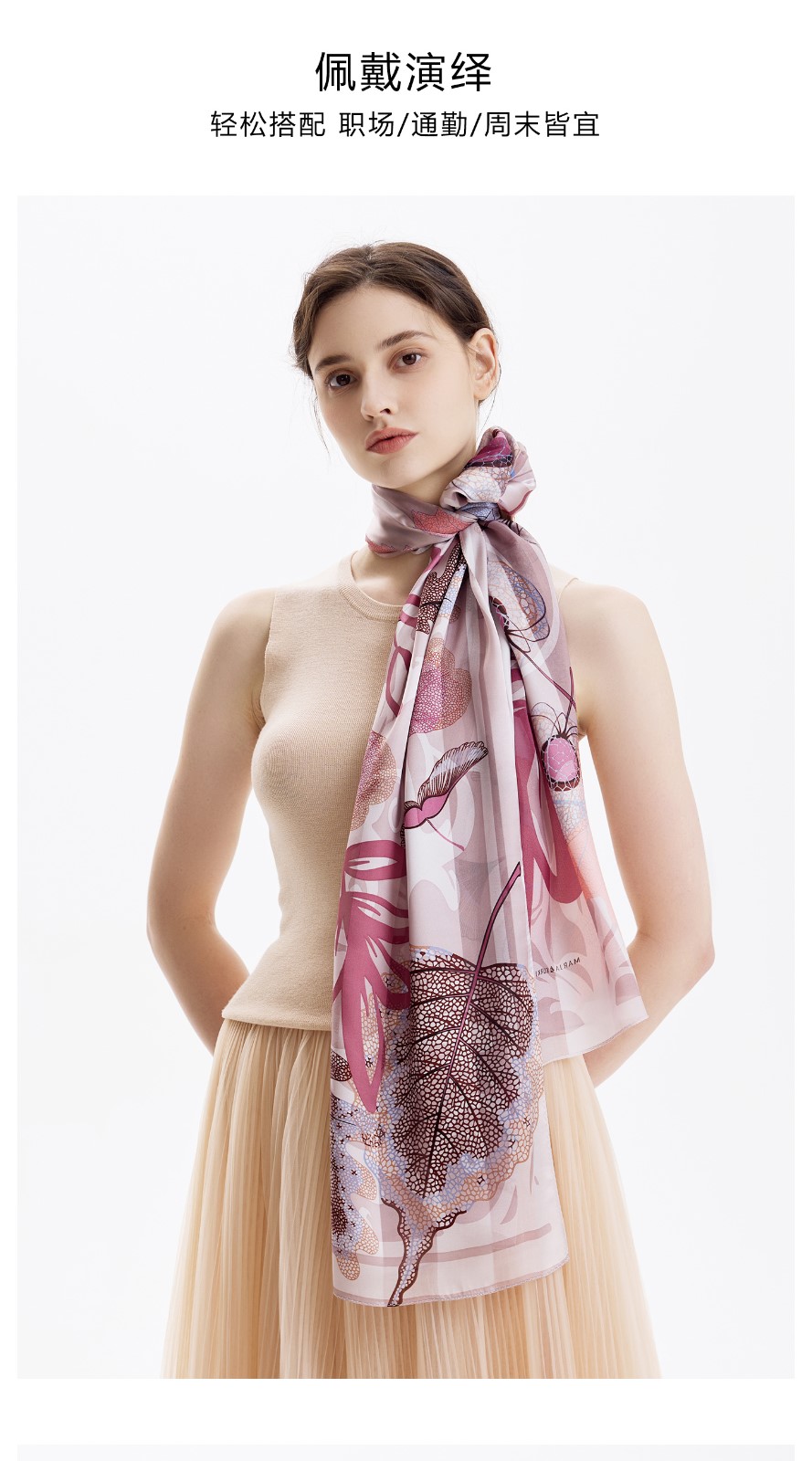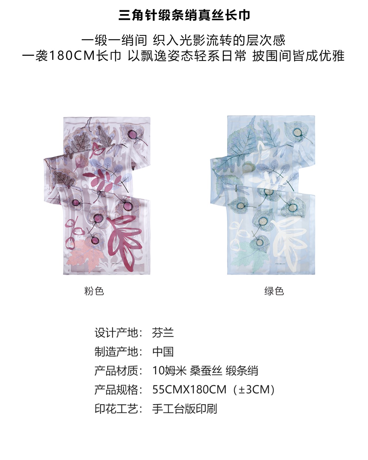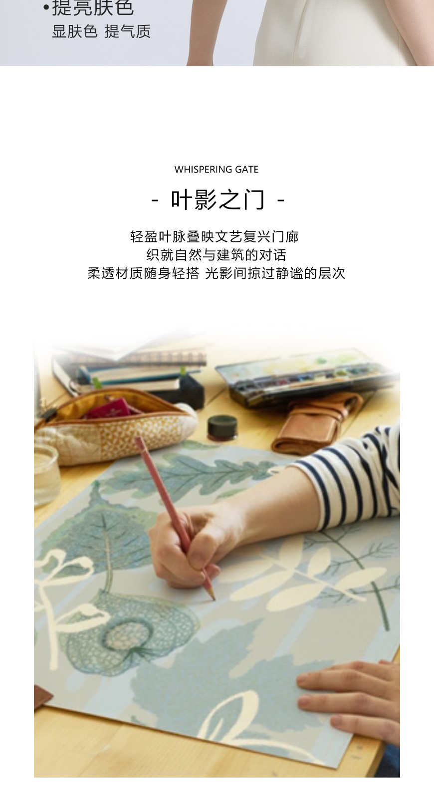 图案从自然与建筑中交织而来:上层是轻盈的叶脉,如风过枝头;底层是一扇文艺复兴风格的铁艺大门,典雅而克制。 材质轻柔透明,每次随手一搭,都让搭配多了一份结构感与灵动感。 它像是一次不动声色的穿越——从花园走向画廊,从生活走向诗意。