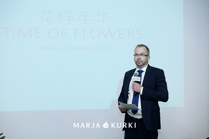 MARJA KURKI中国区总裁、芬兰商会董事会副会长薛锐霞(Caroline)女士和芬兰驻沪总领事万伯阳(Jan Wahlberg)先生依次向在场嘉宾致词,并衷心表达对本季MARJA KURKI丝巾的高度期待以及对品牌未来的美好展望。