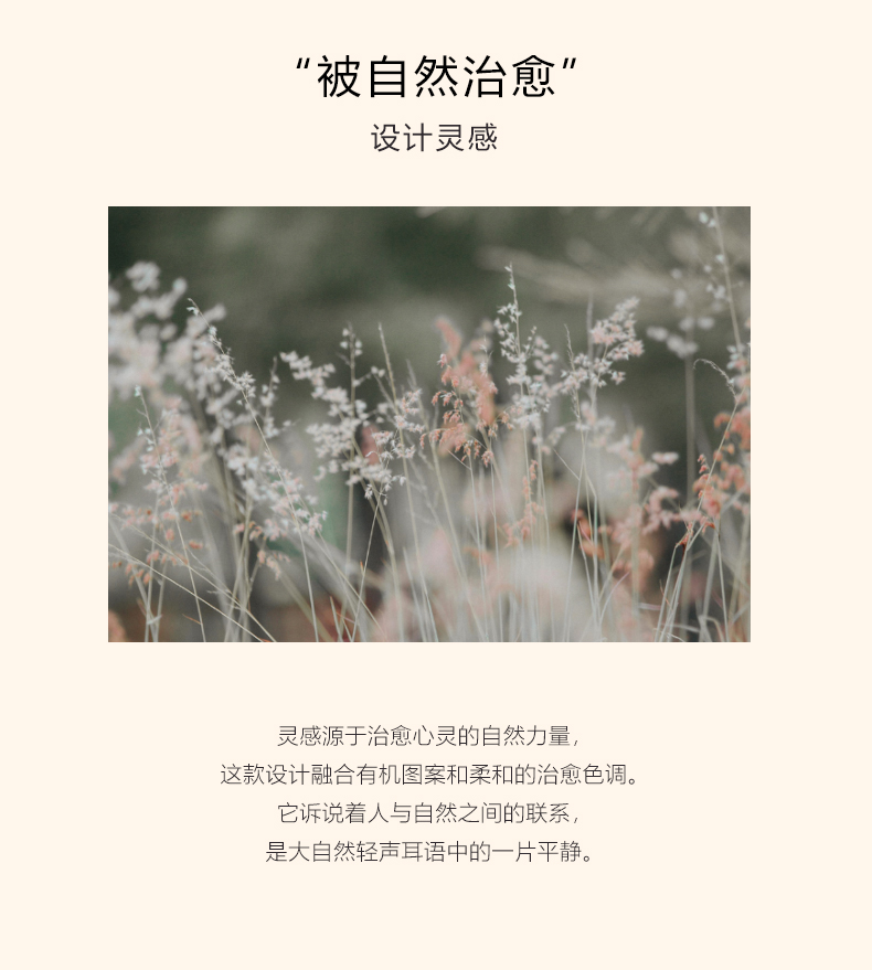 灵感源于治愈心灵的自然力量,这款设计融合有机图案和柔和的治愈色调。它诉说着人与自然之间的联系,是大自然轻声耳语中的一片平静。