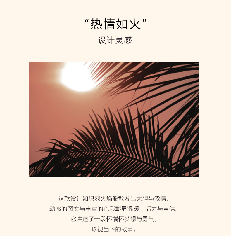这款设计如炽烈火焰般散发出大胆与激情,动感的图案与丰富的色彩彰显温暖、活力与自信。它讲述了一段怀揣怀梦想与勇气,珍视当下的故事。