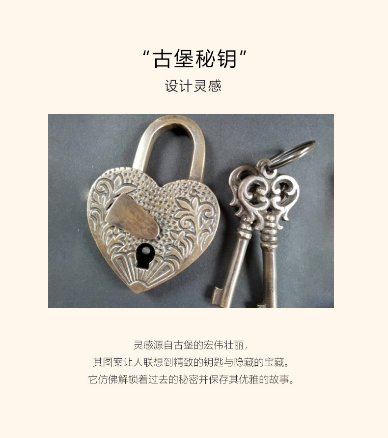 灵感源自古堡的宏伟壮丽,其图案让人联想到精致的钥匙与隐藏的宝藏。它仿佛解锁着过去的秘密并保存其优雅的故事。