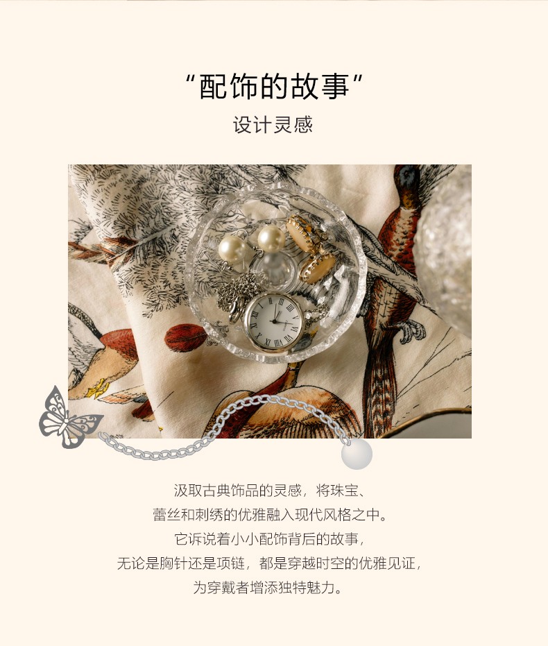 汲取古典饰品的灵感,将珠宝、蕾丝和刺绣的优雅融入现代风格之中。它诉说着小小配饰背后的故事,无论是胸针还是项链,都是穿越时空的优雅见证,为穿戴者增添独特魅力。