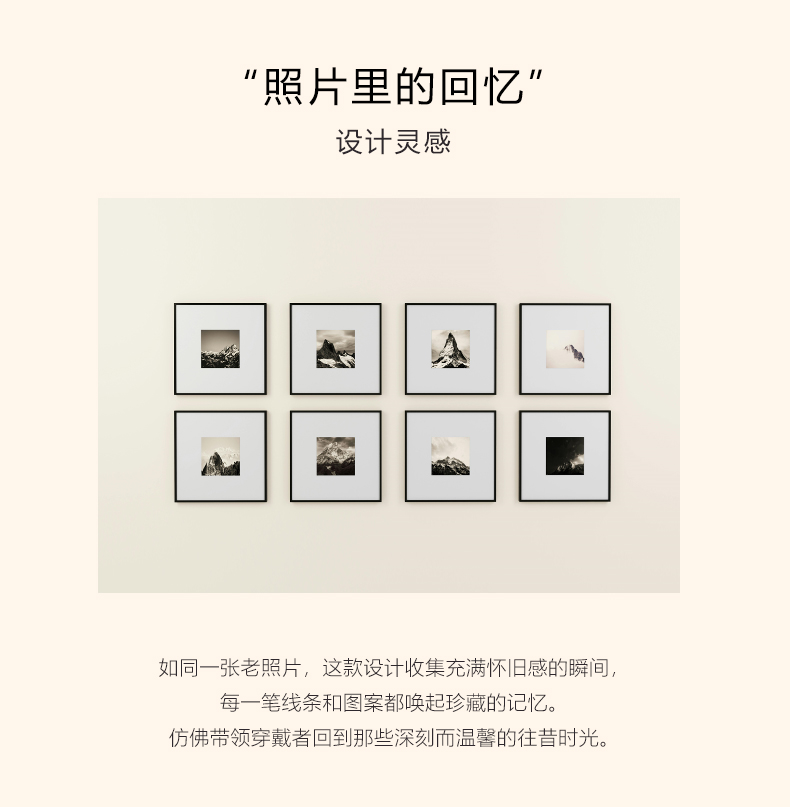 如同一张老照片,这款设计收集充满怀旧感的瞬间,每一笔线条和图案都唤起珍藏的记忆。仿佛带领穿戴者回到那些深刻而温馨的往昔时光。