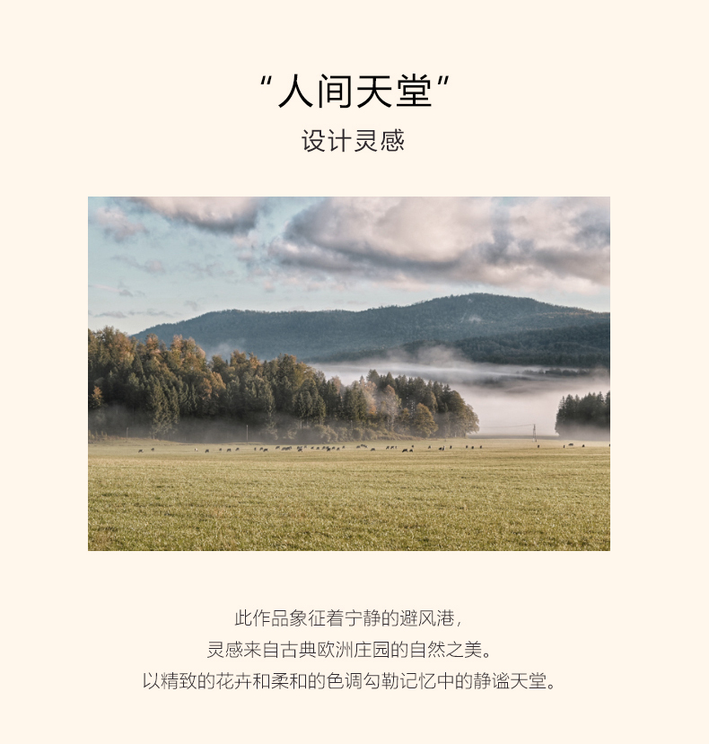 此作品象征着宁静的避风港,灵感来自古典欧洲庄园的自然之美。以精致的花卉和柔和的色调勾勒记忆中的静谧天堂。