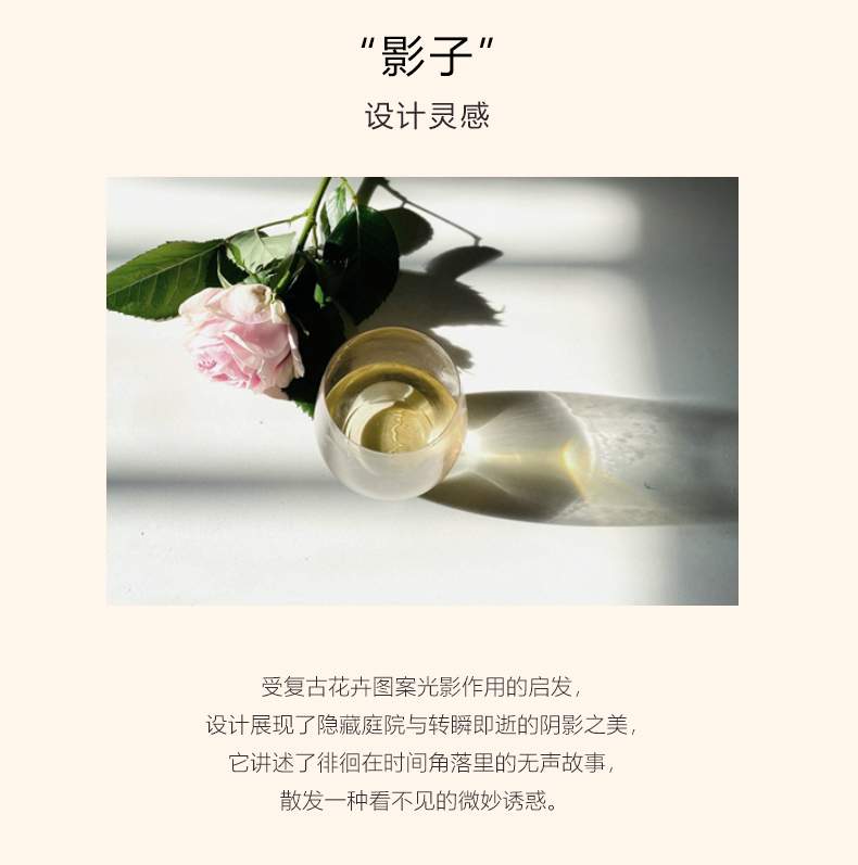 受复古花卉图案光影作用的启发,设计展现了隐藏庭院与转瞬即逝的阴影之美,它讲述了徘徊在时间角落里的无声故事,散发一种看不见的微妙诱惑。