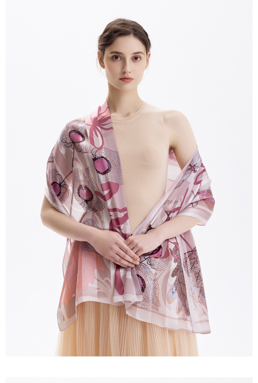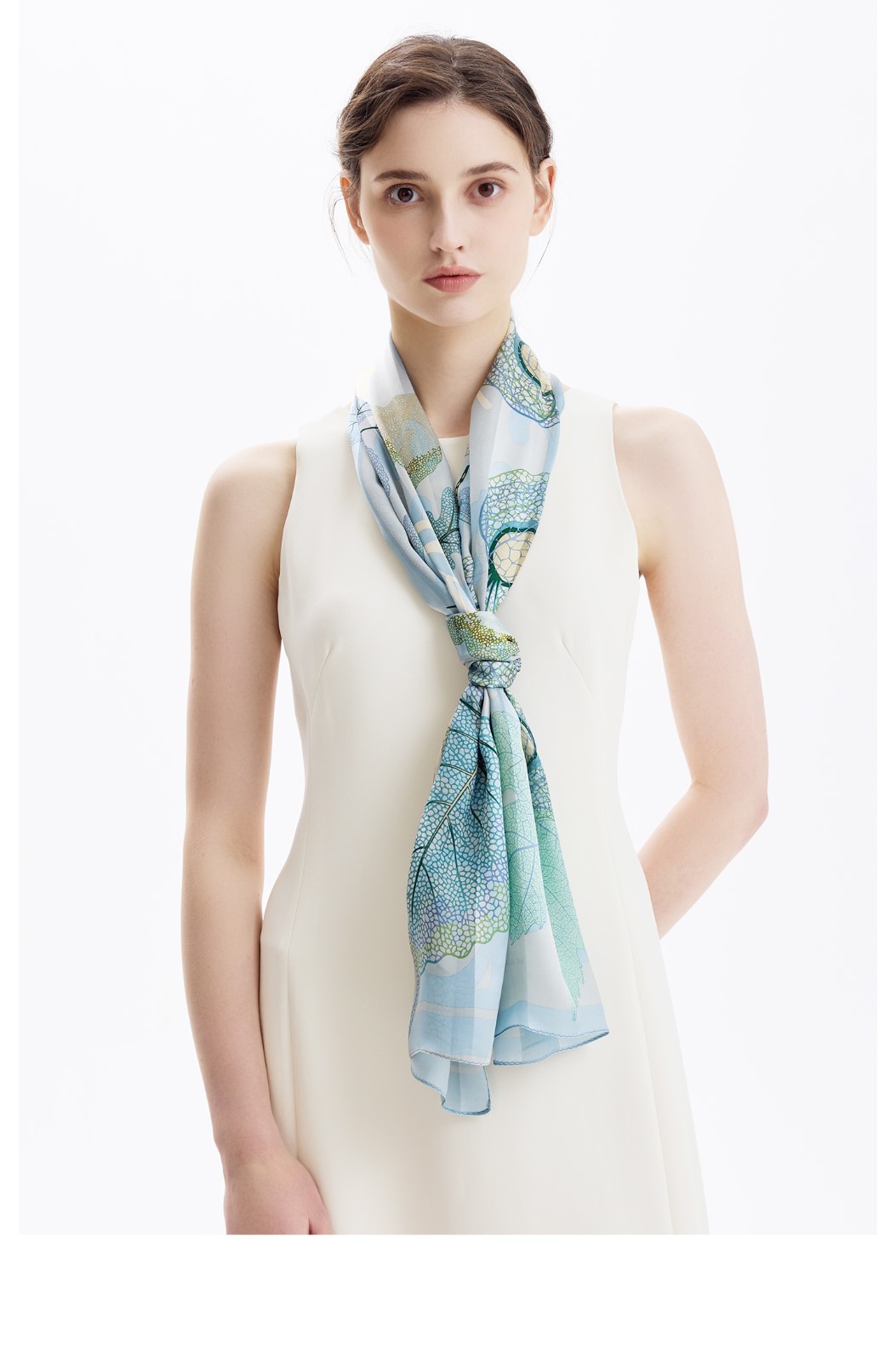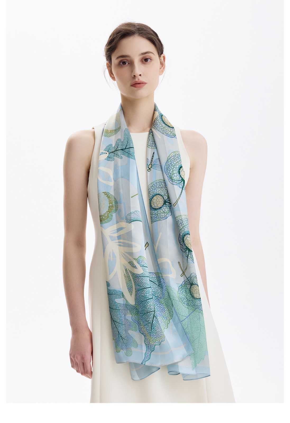 图案从自然与建筑中交织而来:上层是轻盈的叶脉,如风过枝头;底层是一扇文艺复兴风格的铁艺大门,典雅而克制。 材质轻柔透明,每次随手一搭,都让搭配多了一份结构感与灵动感。 它像是一次不动声色的穿越——从花园走向画廊,从生活走向诗意。